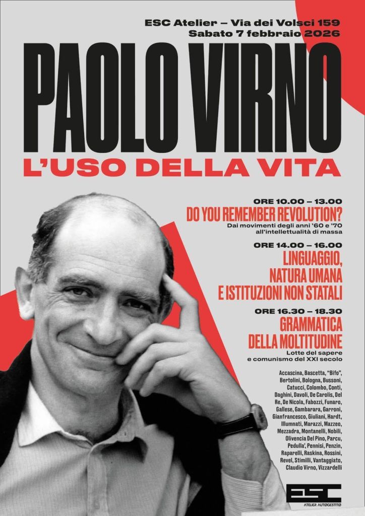 Ieri si è tenuta a Roma una giornata di ricordo in onore di Paolo Virno: attivista, filosofo, combattente. L’evento si è tenuto all’ESC, storico centro sociale di Roma. Per un giorno, la filosofia è tornata ad essere lotta e la lotta memoria viva. E con lei (con la memoria) accade l’evento del pensiero: un pensiero vivo di cui ci si stupisce e ci si rincuora, giacché pensare è un’attività fatta di lunghi periodi solitari, interrotti da momenti di condivisione – da feste del pensiero – sempre più rari.