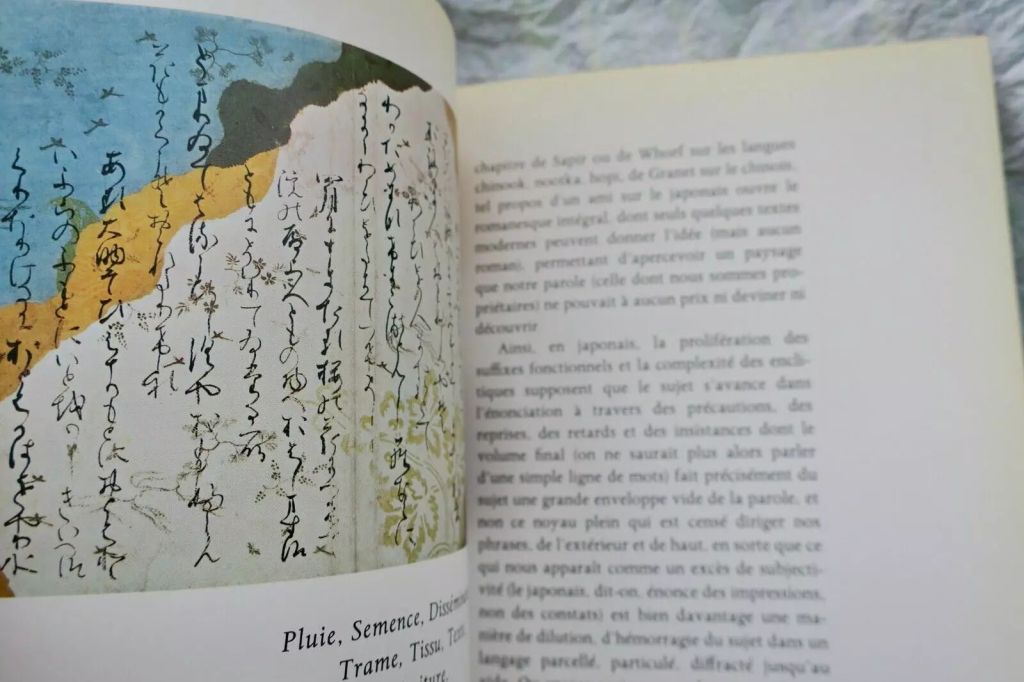 La lingua in funzione della mia esperienza al Giappone è stata il campo di esperienze che ho voluto dire a proposito del Giappone, esaltando quello della comunicazione che vi ho praticato, addirittura al di fuori di una lingua parlata che non conoscevo, ma nel fruscio, nella riserva emotiva di questa lingua sconosciuta. Vivere in un paese di cui non si conosce la lingua, viverci largamente, fuori dai quartieri turistici, è una pericolosa avventura (nel senso ingenuo che l’espressione può avere nei francesi) perché bisogna eccedere il «soggetto» che afferra per ragioni, per rappresentare, cioè nella infittezza senza parole, nella infinità senza profilo dell’esperienza. Immaginare un nuovo Robinson senza paura di un’isola deserta, ma in una fetta di dodici milioni di abitanti di cui non sappia decifrare né parlato né scritto: sarebbe questa, credo, la forma moderna del mito.